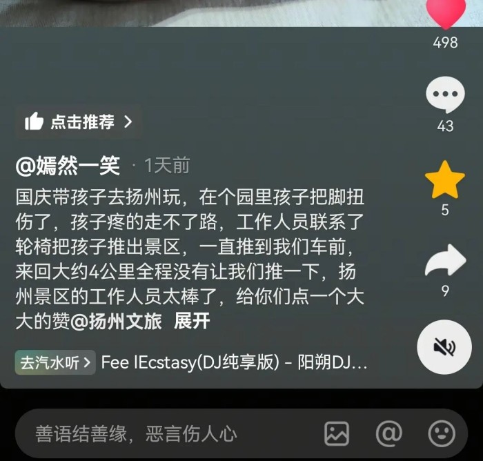 2025年10月2日12点半左右,南部住宅巷道网格员徐逸群、杨阳发现有一位游客行动缓慢,主动上前询问是否需要帮助,得知游客在游玩过程中不小心扭了脚,右脚疼痛影响走路。网格员随即联系了安全管理部门。接到网格员的反馈后,安全管理部门立即安排安全员陈轶亚就近前往个园东门提取轮椅,第一时间赶往游客所在位置。 在丛书楼下,安全员顺利接到该名游客及其家属,用轮椅护送该游客出园。在推行过程中,安全员了解到一行人为自驾游客,车辆停放位置在旅游商贸学校附近。为最大限度提供便利,安全员主动向游客提出,可将他们直接护送至汽车停放处。将游客护送至目的地后,安全员确认游客后续行程无碍后,方才推行轮椅返回。游客及家属对工作人员的贴心服务表示感谢,并在网络平台发文感谢。