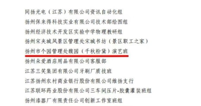 个园千秋粉黛演艺班再获殊荣,成功获评省级“工人先锋号”称号!演艺班自2012年成立以来,始终以弘扬扬州历史文化、传承非遗艺术为己任,多年来坚守匠心并勇于创新。2025年度再次升级推出“千秋粉黛·艺扬州”非遗互动新剧目,融合了扬州清曲、弹词、评话与现代表演形式,不断打磨这一文旅演艺品牌。现有市级非遗传承人1名、区级非遗传承人1名。